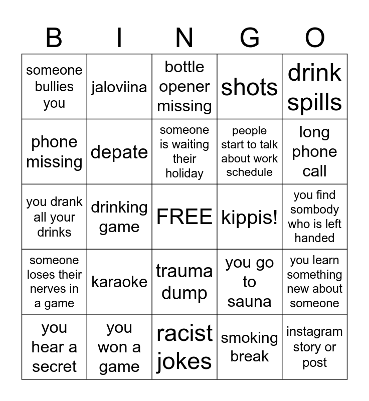 This bingo card has a free space and 24 words: karaoke, you won a game, someone is waiting their holiday, you hear a secret, drink spills, someone bullies you, phone missing, jaloviina, kippis!, trauma dump, people start to talk about work schedule, you drank all your drinks, you go to sauna, you learn something new about someone, depate, smoking break, you find sombody who is left handed, bottle opener missing, long phone call, drinking game, instagram story or post, someone loses their nerves in a game, shots and racist jokes.