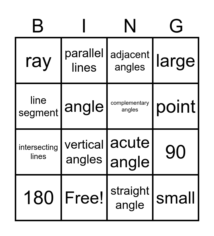 This bingo card has 24 words: angle, point, point, line, line segment, ray, angle, parallel lines, Free!, perpendicular lines, intersecting lines, acute angle, right angle, obtuse angle, complementary angles, supplementary angle, straight angle, adjacent angles, vertical angles, 90, 180, small, large and just right.