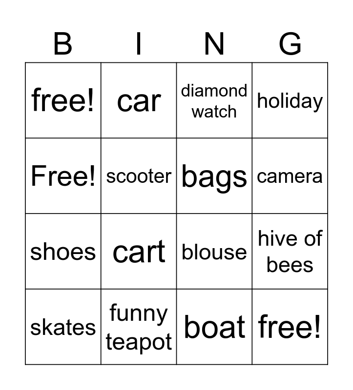 This bingo card has 16 words: funny teapot, hive of bees, diamond watch, free!, shoes, car, blouse, boat, Free!, scooter, skates, holiday, cart, camera, bags and free!.