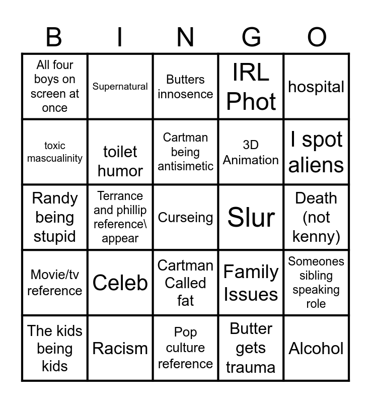 This bingo card has a free space and 24 words: Celeb, Racism, Cartman being antisimetic, The kids being kids, hospital, All four boys on screen at once, toxic mascualinity, Supernatural, Slur, Cartman Called fat, 3D Animation, Randy being stupid, Family Issues, Someones sibling speaking role, toilet humor, Butter gets trauma, Death (not kenny), Butters innosence, I spot aliens, Terrance and phillip reference\ appear, Alcohol, Movie/tv reference, IRL Phot and Pop culture reference.