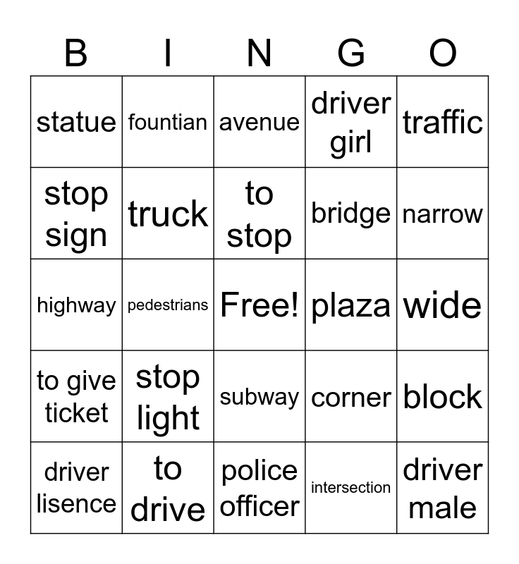 This bingo card has a free space and 24 words: stop light, to drive, to stop, driver lisence, traffic, statue, stop sign, fountian, plaza, subway, bridge, highway, corner, block, truck, intersection, wide, avenue, narrow, pedestrians, driver male, to give ticket, driver girl and police officer.