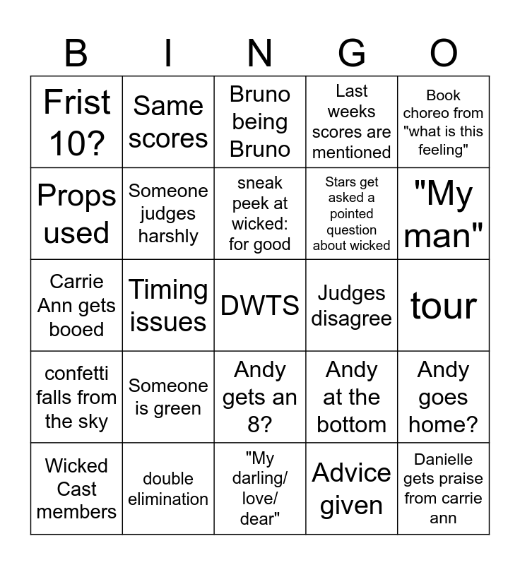 This bingo card has a free space and 24 words: Someone is green, double elimination, sneak peek at wicked: for good, Wicked Cast members, Book choreo from "what is this feeling", Frist 10?, Props used, Same scores, Judges disagree, Andy gets an 8?, Stars get asked a pointed question about wicked, Carrie Ann gets booed, Andy at the bottom, Andy goes home?, Someone judges harshly, Advice given, tour, Bruno being Bruno, "My man", Timing issues, Danielle gets praise from carrie ann, confetti falls from the sky, Last weeks scores are mentioned and "My darling/ love/ dear".