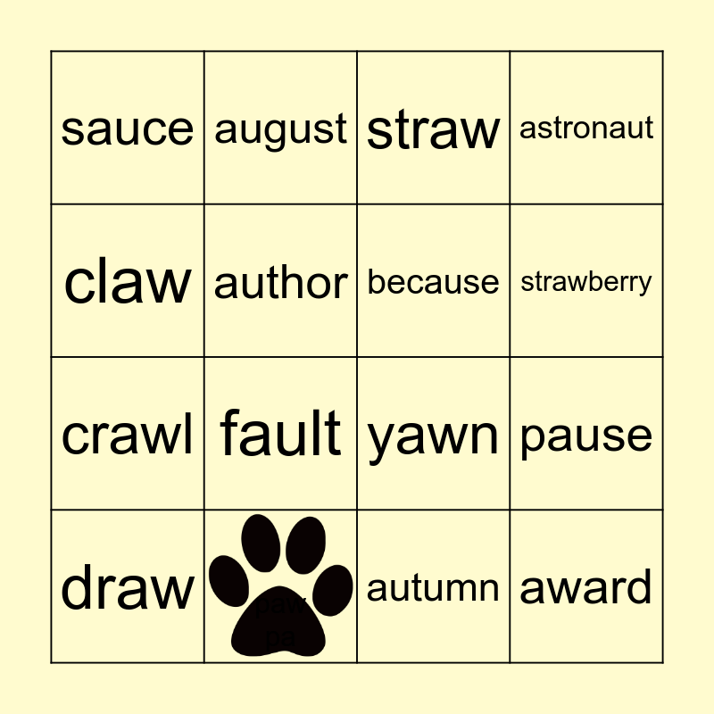 This bingo card has 1 images and 16 words: paw pa, pause, straw, sauce, crawl, august, yawn, autumn, claw, author, draw, astronaut, fault, strawberry, because and award.
