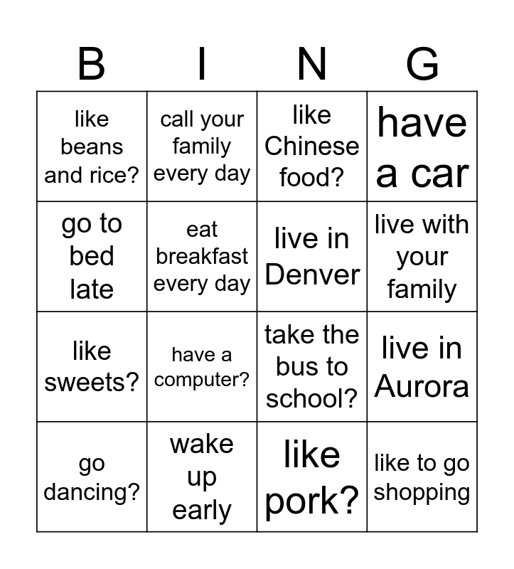 This bingo card has 17 words: like pork?, go dancing?, like Chinese food?, like beans and rice?, have a computer?, have a car, live in Aurora, live in Denver, live with your family, eat breakfast every day, wake up early, take the bus to school?, go to bed late, call your family every day, like sweets?, like to cook? and like to go shopping.