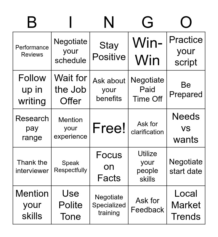 This bingo card has a free space and 24 words: Speak Respectfully, Use Polite Tone, Ask about your benefits, Mention your skills, Practice your script, Performance Reviews, Follow up in writing, Negotiate your schedule, Ask for clarification, Focus on Facts, Negotiate Paid Time Off, Research pay range, Utilize your people skills, Negotiate start date, Wait for the Job Offer, Ask for Feedback, Needs vs wants, Stay Positive, Be Prepared, Mention your experience, Local Market Trends, Thank the interviewer, Win-Win and Negotiate Specialized training.
