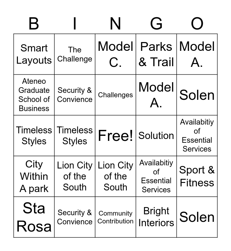 This bingo card has a free space and 48 words: Asian Tropical Design, Solen, Sta Rosa, Community Contribution, Lion City of the South, City Within A park, The Challenge, United Boulevard, Ateneo Graduate School of Business, Family Friendly, Security & Convience, Parks & Trail, Sport & Fitness, Availabitiy of Essential Services, Phase 1, 51 hectares, Challenges, Solution, Model C., Model A., Timeless Styles, Bright Interiors, Smart Layouts, Model A., Asian Tropical Design, Solen, Sta Rosa, Community Contribution, Lion City of the South, City Within A park, The Challenge, United Boulevard, Ateneo Graduate School of Business, Family Friendly, Security & Convience, Parks & Trail, Sport & Fitness, Availabitiy of Essential Services, Phase 1, 51 hectares, Challenges, Solution, Model C., Model A., Timeless Styles, Bright Interiors, Smart Layouts and Model A..