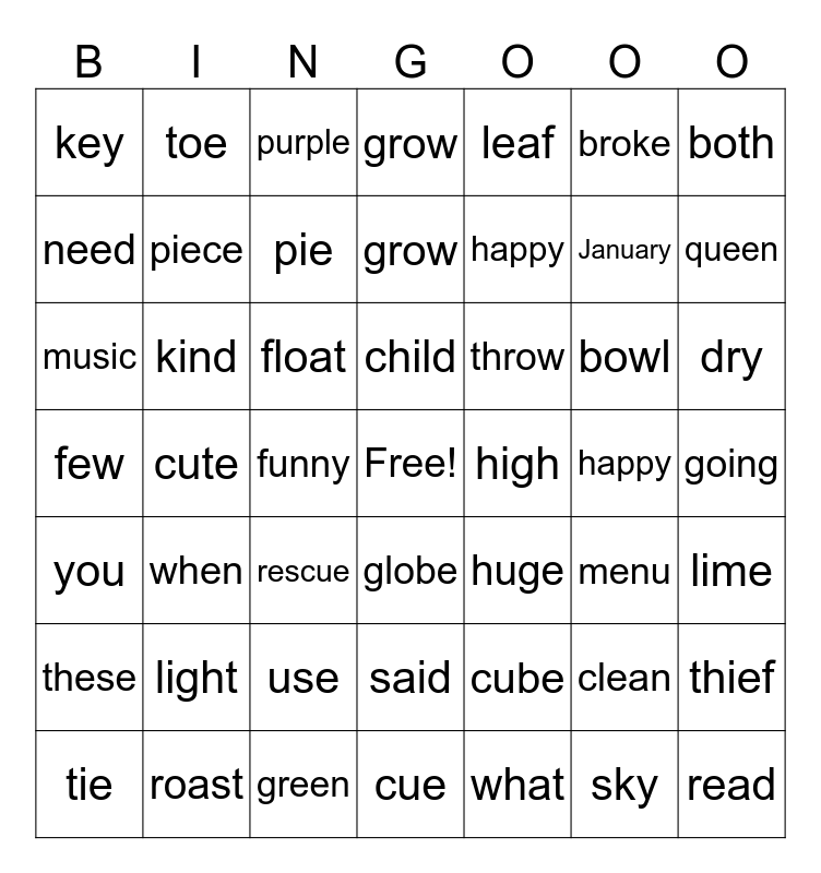 This bingo card has a free space and 48 words: cube, January, cue, cute, float, going, toe, roast, broke, globe, both, grow, bowl, throw, these, happy, need, queen, clean, leaf, happy, funny, key, piece, thief, pie, dry, tie, child, kind, sky, high, lime, light, few, huge, menu, music, rescue, use, you, read, purple, green, grow, said, when and what.