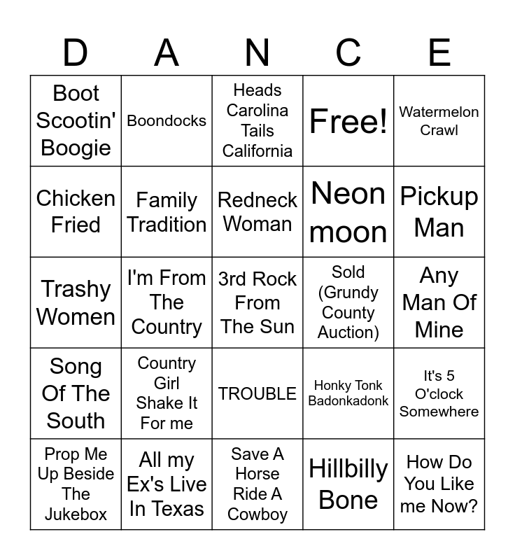 This bingo card has 48 words: I Like It I Love It, 3rd Rock From The Sun, I Feel Lucky, Save A Horse Ride A Cowboy, Country Girl Shake It For me, Wagon Wheel, Boondocks, Toes, Chicken Fried, When The Sun Goes Down, Family Tradition, Free!, It's 5 O'clock Somewhere, Honky Tonk Badonkadonk, She Thinks My Tractors Sexy, Chattahooche, Redneck Woman, Sold (Grundy County Auction), God Blessed Texas, Watermelon Crawl, I'm From The Country, Hillbilly Bone, Boot Scootin' Boogie, Neon moon, Little Bitty, Pickup Man, Prop Me Up Beside The Jukebox, Straight Tequila Night, TROUBLE, Song Of The South, Don't Rock The Jukebox, Achy breaky Heart, Baby Likes To Rock it, Honky Tonk Man, All my Ex's Live In Texas, Be My baby Tonight, Down at The Twist & Shout, Any Man Of Mine, Whose bed have Your Boots Been Under, Indian Outlaw, Should've Been A Cowboy, How Do You Like me Now?, Heads Carolina Tails California, No One Else On Earth, Trashy Women, Born Country, Louisiana Saturday Night and Bubba Shot The Jukebox.