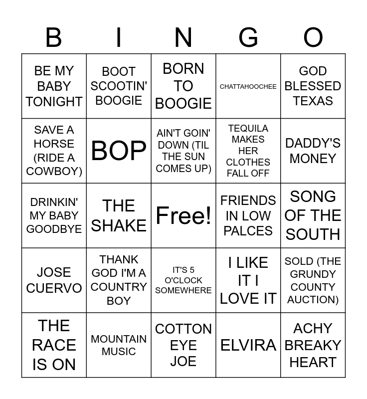 This bingo card has a free space and 46 words: 9 TO 5, ACHY BREAKY HEART, MAN I FEEL LIKE A WOMAN, COTTON EYE JOE, THANK GOD I'M A COUNTRY BOY, BABY LIKES TO ROCK IT, BOOT SCOOTIN' BOOGIE, ANY MAN OF MINE, SAVE A HORSE (RIDE A COWBOY), CALLIN' BATON ROUGE, BOP, CHATTAHOOCHEE, SOLD (THE GRUNDY COUNTY AUCTION), I LIKE IT I LOVE IT, WATERMELON CRAWL, TROUBLE, AIN'T GOIN' DOWN (TIL THE SUN COMES UP), FRIENDS IN LOW PALCES, POUR ME, GOD BLESSED TEXAS, THE SHAKE, ELVIRA, BE MY BABY TONIGHT, TEQUILA MAKES HER CLOTHES FALL OFF, HOW DO YOU LIKE ME NOW, DADDY'S MONEY, THE RACE IS ON, DOWN AT THE TWIST & SHOUT, IT'S 5 O'CLOCK SOMEWHERE, JOSE CUERVO, MEET IN THE MIDDLE, LOUISIANA SATURDAY NIGHT, DON'T ROCK THE JUKEBOX, I'M FROM THE COUNTRY, REDNECK GIRL, MOUNTAIN MUSIC, SONG OF THE SOUTH, SOME GIRLS DO, BUBBA SHOT THE JUKEBOX, DRINKIN' BONE, SWINGIN', BORN TO BOOGIE, DRINKIN' MY BABY GOODBYE, IT'S A GREAT DAY TO BE ALIVE, THE FIREMAN and PICKUP MAN.
