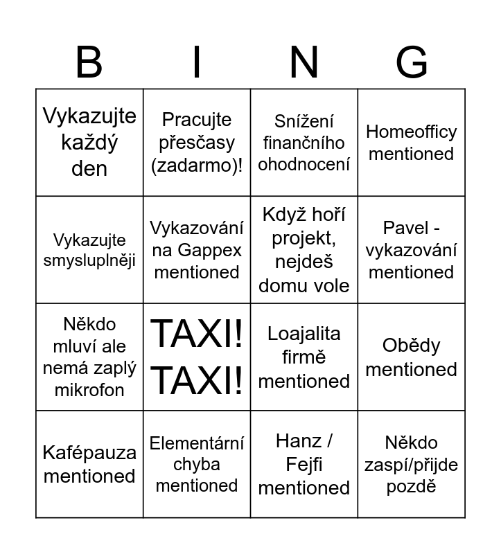 This bingo card has 16 words: Elementární chyba mentioned, Obědy mentioned, Snížení finančního ohodnocení, Vykazujte každý den, Někdo mluví ale nemá zaplý mikrofon, Pracujte přesčasy (zadarmo)!, Loajalita firmě mentioned, Hanz / Fejfi mentioned, Vykazujte smysluplněji, Vykazování na Gappex mentioned, Kafépauza mentioned, Homeofficy mentioned, TAXI! TAXI!, Pavel - vykazování mentioned, Když hoří projekt, nejdeš domu vole and Někdo zaspí/přijde pozdě.