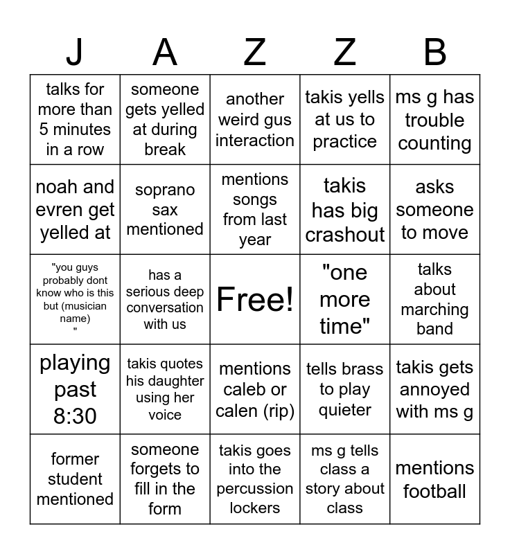 This bingo card has a free space and 28 words: takis gets annoyed with ms g, sectionals!!, takis has big crashout, ms g tells class a story about class, noah and evren get yelled at, another weird gus interaction, someone gets yelled at during break, playing past 8:30, "one more time", former student mentioned, "you guys probably dont know who is this but (musician name) ", takis yells at us to practice, someone forgets to fill in the form, takis goes into the percussion lockers, asks someone to move, part of someones instrument gets taken, takis quotes his daughter using her voice, soprano sax mentioned, mentions songs from last year, mentions caleb or calen (rip), talks for more than 5 minutes in a row, gets annoyed and says "lets play", mentions football, has a serious deep conversation with us, talks about marching band, tells brass to play quieter, ms g has trouble counting and takis talks about brainrot.
