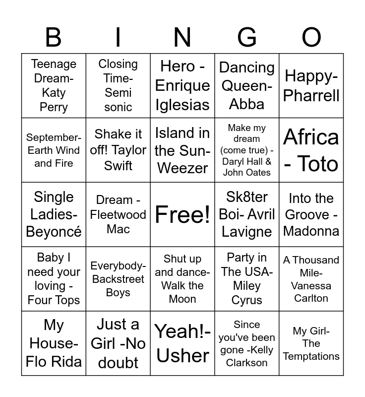 This bingo card has a free space and 29 words: My House- Flo Rida, Hey Ya- Outkast, Dream - Fleetwood Mac, Baby one more time- Britney Spears, Teenage Dream- Katy Perry, Hero - Enrique Iglesias, Shake it off! Taylor Swift, Everybody- Backstreet Boys, Sk8ter Boi- Avril Lavigne, Just a Girl -No doubt, Into the Groove - Madonna, My Girl- The Temptations, Yeah!- Usher, Since you've been gone -Kelly Clarkson, Africa - Toto, LOW Flo Rida, Shut up and dance- Walk the Moon, Baby I need your loving - Four Tops, Happy- Pharrell, Single Ladies- Beyoncé, Party in The USA- Miley Cyrus, Rolling in the deep- Adele, Make my dream (come true) - Daryl Hall & John Oates, September- Earth Wind and Fire, Dancing Queen-Abba, Closing Time- Semi sonic, A Thousand Mile- Vanessa Carlton, Island in the Sun-Weezer and Santeria Sublime.