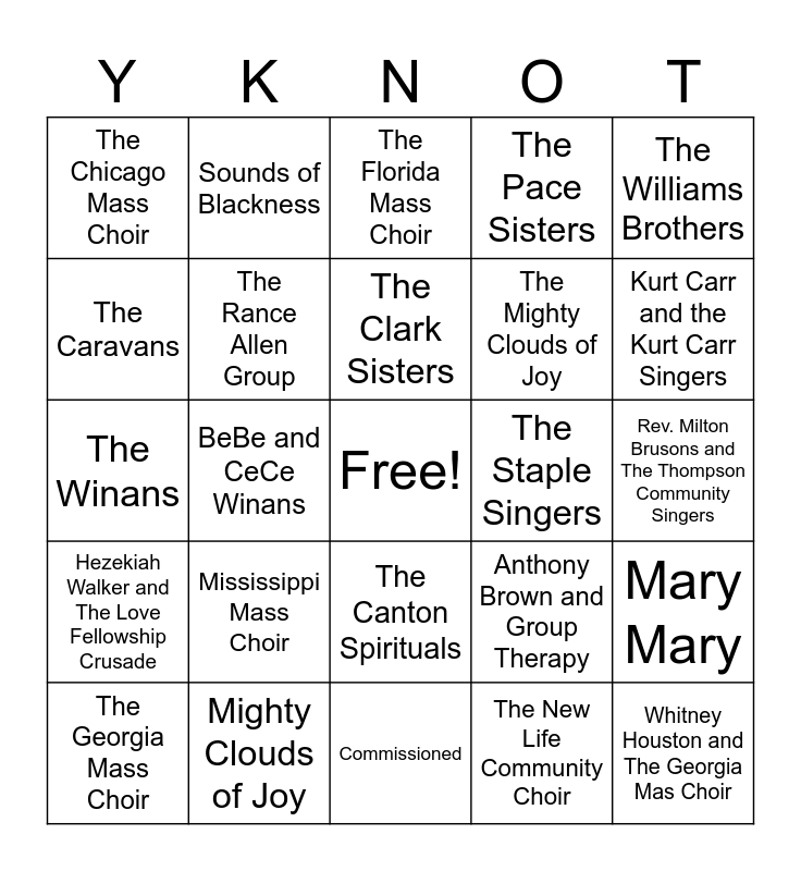 This bingo card has a free space and 24 words: Mississippi Mass Choir, Mighty Clouds of Joy, The Clark Sisters, The Georgia Mass Choir, The Williams Brothers, The Chicago Mass Choir, The Caravans, Sounds of Blackness, The Staple Singers, The Canton Spirituals, The Mighty Clouds of Joy, The Winans, Anthony Brown and Group Therapy, Mary Mary, The Rance Allen Group, The New Life Community Choir, Rev. Milton Brusons and The Thompson Community Singers, The Florida Mass Choir, Kurt Carr and the Kurt Carr Singers, BeBe and CeCe Winans, Whitney Houston and The Georgia Mas Choir, Hezekiah Walker and The Love Fellowship Crusade, The Pace Sisters and Commissioned.