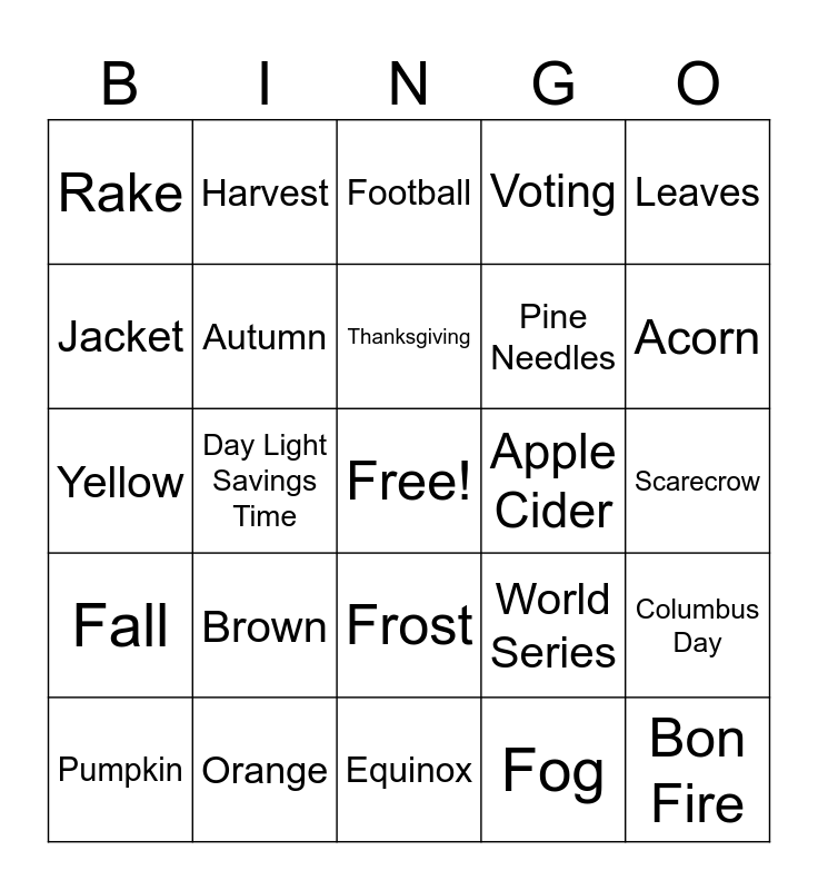 This bingo card has a free space and 34 words: Firewood, Fog, Corn Maze, Pumpkin Patch, Fall, Autumn, Leaves, Pumpkin, Harvest, Halloween, Thanksgiving, Football, Baseball, Sweater, Apple Cider, Acorn, Orange, Yellow, Brown, World Series, Frost, Migration, Rake, Scarecrow, Equinox, Bon Fire, Voting, Leaves, Pine Needles, Jacket, Rain, Day Light Savings Time, Columbus Day and Hat and Gloves.