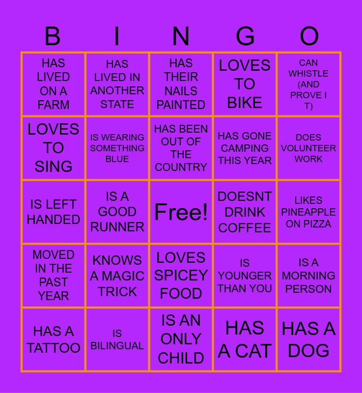 This bingo card has a free space and 29 words: HAS A TATTOO, HAS BEEN TO A CONCERT THIS MONTH, IS A GOOD RUNNER, HAS A BROTHER, HAS LIVED ON A FARM, HAS THEIR NAILS PAINTED, IS WEARING SOMETHING BLUE, KNOWS A MAGIC TRICK, DOESNT DRINK COFFEE, IS BILINGUAL, LIKES PINEAPPLE ON PIZZA, HAS A DOG, IS AN ONLY CHILD, HAS A CAT, DOES VOLUNTEER WORK, IS THE SAME AGE AS YOU, LOVES SPICEY FOOD, MOVED IN THE PAST YEAR, CAN WHISTLE (AND PROVE IT), IS LEFT HANDED, IS YOUNGER THAN YOU, HAS HAD SURGERY, HAS GONE CAMPING THIS YEAR, LOVES TO SING, LOVES TO BIKE, HAS LIVED IN ANOTHER STATE, IS A MORNING PERSON, HAS BEEN OUT OF THE COUNTRY and READ MORE THAN 5 BOOKS THIS YEAR.