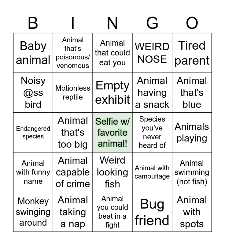 This bingo card has a free space and 24 words: Animal capable of crime, Animal taking a nap, Empty exhibit, Monkey swinging around, Tired parent, Baby animal, Noisy @ss bird, Animal that's poisonous/ venomous, Species you've never heard of, Weird looking fish, Animal having a snack, Endangered species, Animal with camouflage, Animal swimming (not fish), Motionless reptile, Bug friend, Animals playing, Animal that could eat you, Animal that's blue, Animal that's too big, Animal with spots, Animal with funny name, WEIRD NOSE and Animal you could beat in a fight.