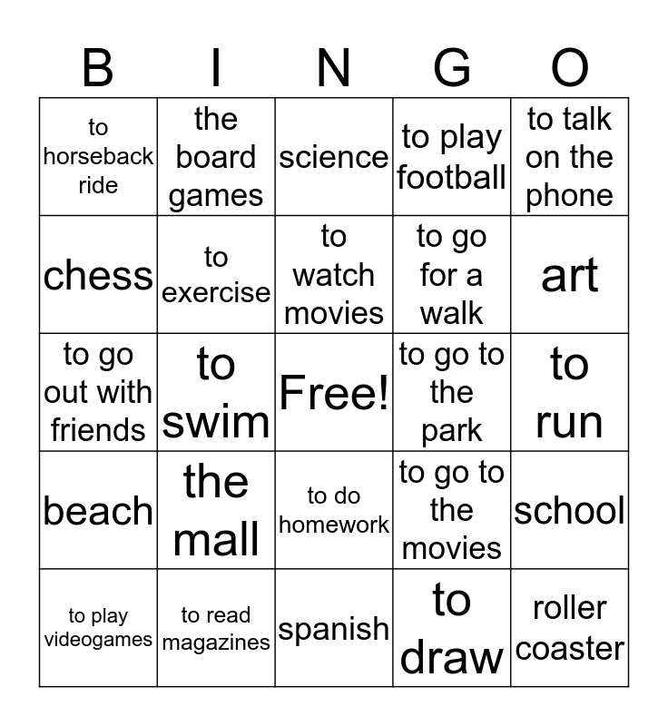 This bingo card has a free space and 24 words: the mall, to read magazines, to watch movies, to play videogames, to talk on the phone, to horseback ride, chess, the board games, to go to the park, to do homework, to go for a walk, to go out with friends, to go to the movies, school, to exercise, to draw, to run, science, art, to swim, roller coaster, beach, to play football and spanish.