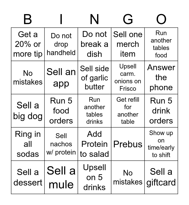 This bingo card has 25 words: Sell nachos w/ protein, Upsell on 5 drinks, Sell side of garlic butter, Sell a dessert, Run another tables food, Get a 20% or more tip, No mistakes, Do not drop handheld, Get refill for another table, Add Protein to salad, Upsell carm. onions on Frisco, Sell a big dog, Prebus, Show up on time/early to shift, Sell an app, Sell a giftcard, Run 5 drink orders, Do not break a dish, Answer the phone, Run 5 food orders, Run another tables drinks, Sell a mule, Ring in all sodas, Sell one merch item and No mistakes.