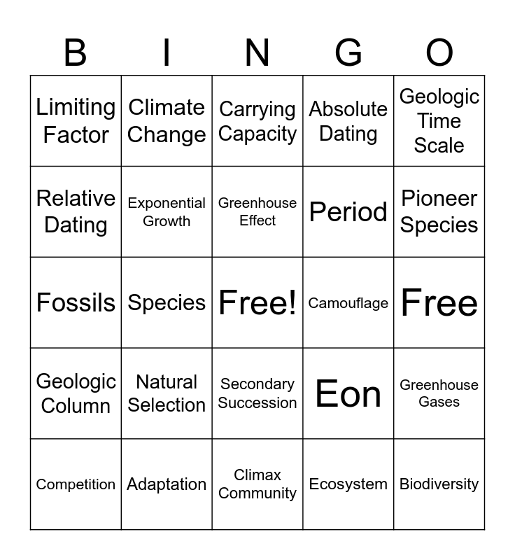 This bingo card has a free space and 29 words: Competition, Population, Species, Ecologists, Limiting Factor, Carrying Capacity, Exponential Growth, Natural Selection, Camouflage, Adaptation, Free, Biodiversity, Climax Community, Ecosystem, Pioneer Species, Primary Succession, Secondary Succession, Geologic Column, Geologic Time Scale, Fossils, Eon, Era, Period, Relative Dating, Absolute Dating, Climate Change, Greenhouse Gases, Greenhouse Effect and Free!.