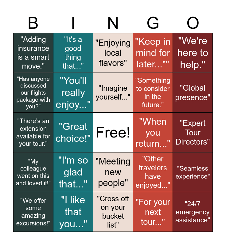 This bingo card has a free space and 24 words: "We offer some amazing excursions!", "I'm so glad that...", "Imagine yourself...", "For your next tour...", "We're here to help.", "Adding insurance is a smart move.", "It's a good thing that...", "Enjoying local flavors", "When you return...", "Expert Tour Directors", "There’s an extension available for your tour.", "You'll really enjoy...", "Other travelers have enjoyed...", "Seamless experience", "Has anyone discussed our flights package with you?", "I like that you...", "Cross off on your bucket list", "Keep in mind for later..."", "Global presence", "My colleague went on this and loved it!", "Great choice!", "Meeting new people", "Something to consider in the future." and "24/7 emergency assistance".