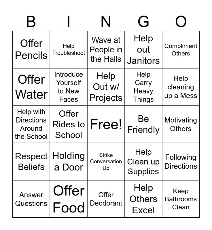 This bingo card has a free space and 24 words: Holding a Door, Offer Food, Help Out w/ Projects, Answer Questions, Compliment Others, Offer Pencils, Offer Water, Help Troubleshoot, Be Friendly, Strike Conversation Up, Help Carry Heavy Things, Help with Directions Around the School, Help Clean up Supplies, Following Directions, Introduce Yourself to New Faces, Help Others Excel, Motivating Others, Wave at People in the Halls, Help cleaning up a Mess, Offer Rides to School, Keep Bathrooms Clean, Respect Beliefs, Help out Janitors and Offer Deodorant.
