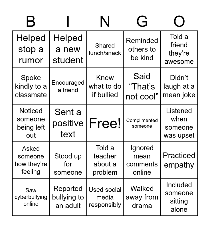 This bingo card has a free space and 24 words: Stood up for someone, Reported bullying to an adult, Knew what to do if bullied, Saw cyberbullying online, Told a friend they’re awesome, Helped stop a rumor, Spoke kindly to a classmate, Helped a new student, Complimented someone, Told a teacher about a problem, Said “That’s not cool”, Noticed someone being left out, Ignored mean comments online, Practiced empathy, Encouraged a friend, Walked away from drama, Listened when someone was upset, Shared lunch/snack, Didn’t laugh at a mean joke, Sent a positive text, Included someone sitting alone, Asked someone how they’re feeling, Reminded others to be kind and Used social media responsibly.