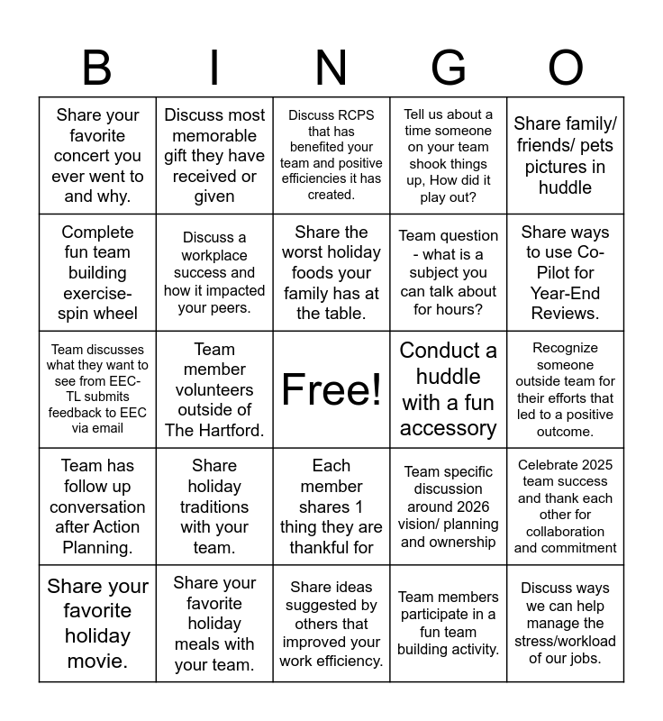 This bingo card has a free space and 24 words: Share holiday traditions with your team., Share your favorite holiday meals with your team., Share the worst holiday foods your family has at the table., Share your favorite holiday movie., Share family/ friends/ pets pictures in huddle, Share your favorite concert you ever went to and why., Complete fun team building exercise- spin wheel, Discuss most memorable gift they have received or given, Conduct a huddle with a fun accessory, Each member shares 1 thing they are thankful for, Team question - what is a subject you can talk about for hours?, Team discusses what they want to see from EEC- TL submits feedback to EEC via email, Team specific discussion around 2026 vision/ planning and ownership, Celebrate 2025 team success and thank each other for collaboration and commitment, Discuss a workplace success and how it impacted your peers., Team members participate in a fun team building activity., Recognize someone outside team for their efforts that led to a positive outcome., Discuss RCPS that has benefited your team and positive efficiencies it has created., Share ways to use Co-Pilot for Year-End Reviews., Team member volunteers outside of The Hartford., Discuss ways we can help manage the stress/workload of our jobs., Team has follow up conversation after Action Planning., Tell us about a time someone on your team shook things up, How did it play out? and Share ideas suggested by others that improved your work efficiency..
