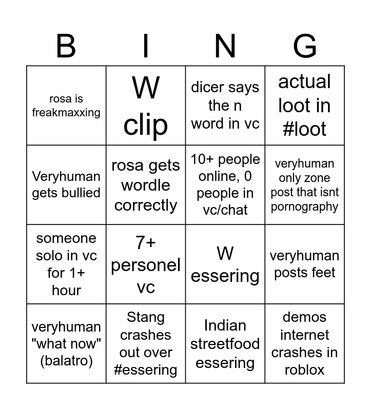 This bingo card has 16 words: Stang crashes out over #essering, veryhuman posts feet, dicer says the n word in vc, rosa is freakmaxxing, someone solo in vc for 1+ hour, W clip, W essering, Indian streetfood essering, Veryhuman gets bullied, rosa gets wordle correctly, veryhuman "what now" (balatro), actual loot in #loot, 7+ personel vc, veryhuman only zone post that isnt pornography, 10+ people online, 0 people in vc/chat and demos internet crashes in roblox.