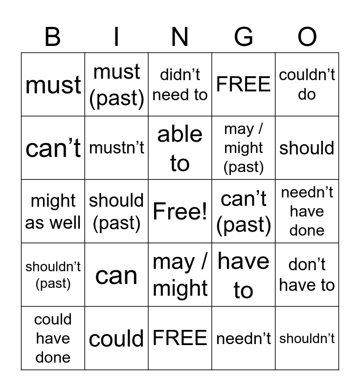 This bingo card has a free space and 24 words: can, could, able to, could have done, couldn’t do, must, can’t, must (past), can’t (past), may / might, may / might (past), might as well, have to, don’t have to, mustn’t, needn’t, needn’t have done, didn’t need to, should, should (past), shouldn’t, shouldn’t (past), FREE and FREE.