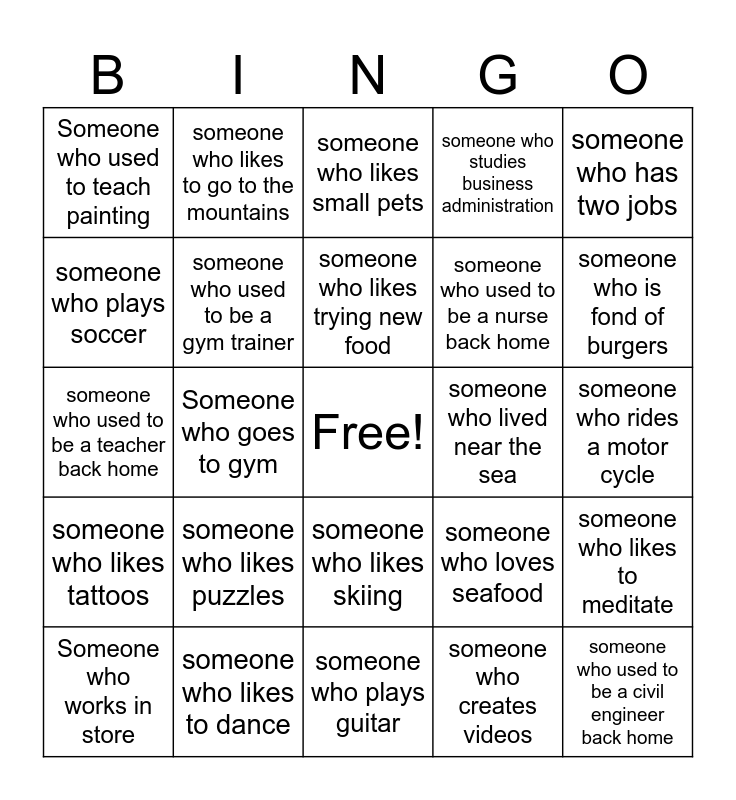 This bingo card has a free space and 29 words: Someone who works in store, Someone who doesn't like driving, Someone who goes to gym, someone who doesn't like being alone, Someone who used to teach painting, someone who likes small pets, someone who used to be a gym trainer, someone who likes puzzles, someone who lived near the sea, someone who likes to dance, someone who rides a motor cycle, someone who used to be a civil engineer back home, someone who plays guitar, someone who creates videos, someone who is fond of burgers, someone who goes rock climbing, someone who likes skiing, someone who likes tattoos, someone who has two jobs, someone who used to be a teacher back home, someone who loves seafood, someone who likes gardening, someone who used to be a nurse back home, someone who plays soccer, someone who studies business administration, someone who likes to go to the mountains, someone who likes to meditate, someone who likes trying new food and someone who doesn't like trying new food.