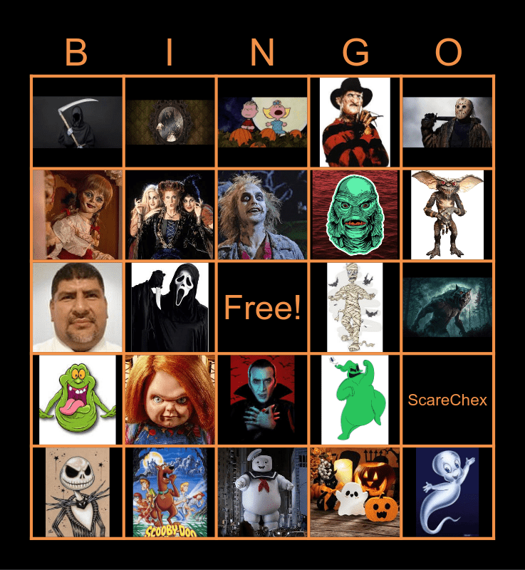 This bingo card has 38 images, a free space and 1 words: ScareChex.