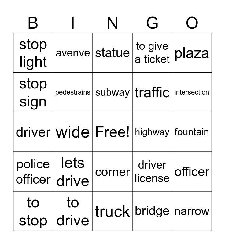 This bingo card has a free space and 24 words: lets drive, to drive, subway, to stop, plaza, stop light, stop sign, avenve, highway, corner, traffic, driver, driver license, officer, pedestrains, bridge, fountain, statue, intersection, wide, narrow, police officer, to give a ticket and truck.