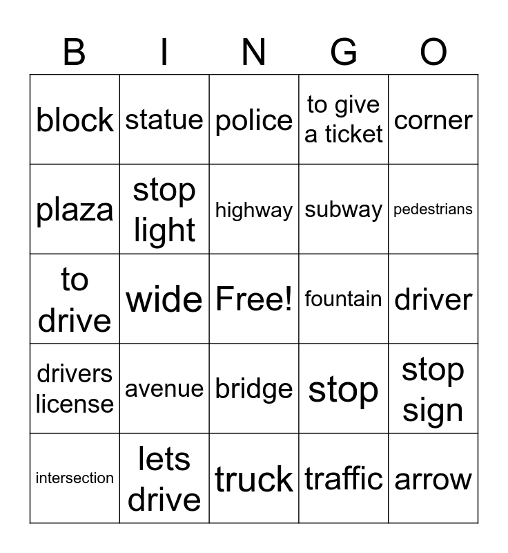 This bingo card has a free space and 24 words: avenue, lets drive, highway, intersection, corner, block, plaza, statue, fountain, bridge, subway, to drive, stop, stop sign, stop light, traffic, driver, police, pedestrians, wide, arrow, drivers license, to give a ticket and truck.