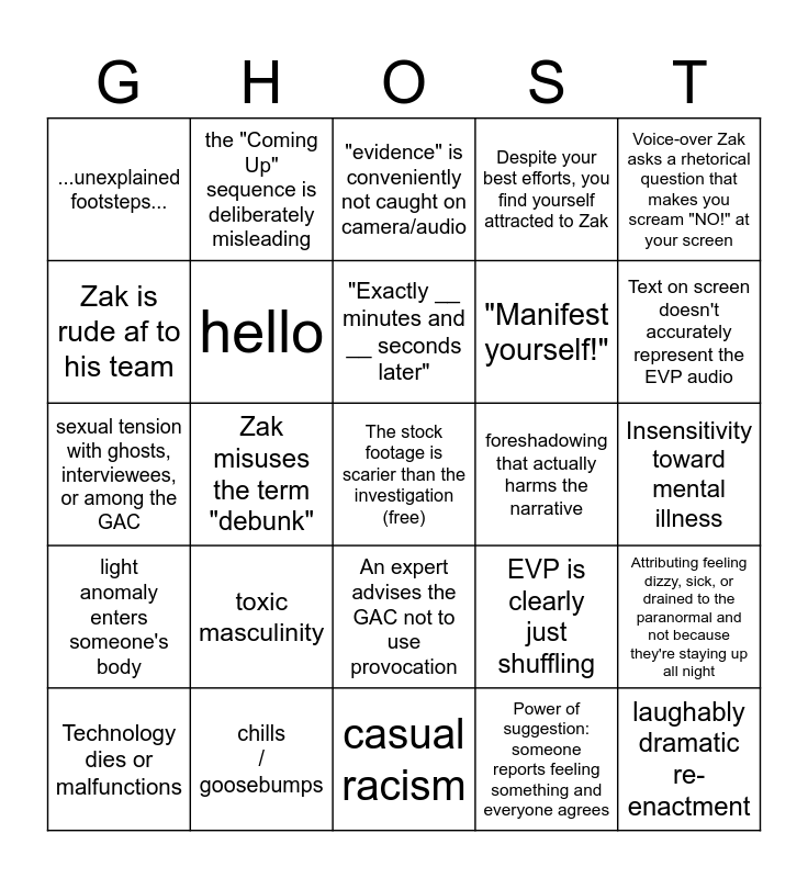 This bingo card has a free space and 26 words: An expert advises the GAC not to use provocation, Power of suggestion: someone reports feeling something and everyone agrees, "Exactly __ minutes and __ seconds later", chills / goosebumps, Voice-over Zak asks a rhetorical question that makes you scream "NO!" at your screen, ...unexplained footsteps..., Zak is rude af to his team, the "Coming Up" sequence is deliberately misleading, Insensitivity toward mental illness, EVP is clearly just shuffling, "Manifest yourself!", sexual tension with ghosts, interviewees, or among the GAC, Attributing feeling dizzy, sick, or drained to the paranormal and not because they're staying up all night, Technology dies or malfunctions, Zak misuses the term "debunk", catholicism, Despite your best efforts, you find yourself attracted to Zak, light anomaly enters someone's body, "evidence" is conveniently not caught on camera/audio, laughably dramatic re-enactment, Text on screen doesn't accurately represent the EVP audio, casual racism, foreshadowing that actually harms the narrative, toxic masculinity, hello and yes.
