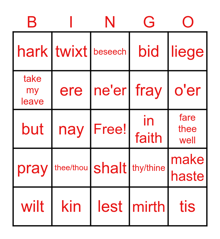 This bingo card has a free space and 55 words: alas, anon, ay, bid, make haste, dost thou, ere, fie, fray, whence, hark, doth, hence, hie, hither, hold, beseech, in faith, charge, pray, kin, lest, mirth, liege, naught, nay, ne'er, o', o'er, oft, alack, shalt, hath, forsworn, take my leave, thee/thou, thence, thy/thine, tis, twas, twixt, unhand me, wherefore, whither, wilt, yonder, upon my honour, withal, be not, but, but soft, by my troth, come hither, fare thee well and adieu.