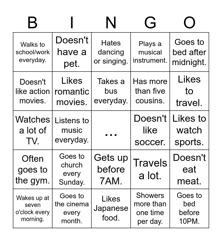 This bingo card has a free space and 24 words: Wakes up at seven o'clock every morning., Goes to church every Sunday., Takes a bus everyday., Showers more than one time per day., Goes to bed after midnight., Walks to school/work everyday., Doesn't have a pet., Hates dancing or singing., Doesn't like soccer., Likes to watch sports., Watches a lot of TV., Likes romantic movies., Travels a lot., Doesn't eat meat., Doesn't like action movies., Goes to the cinema every month., Likes Japanese food., Plays a musical instrument., Likes to travel., Often goes to the gym., Listens to music everyday., Gets up before 7AM., Has more than five cousins. and Goes to bed before 10PM..