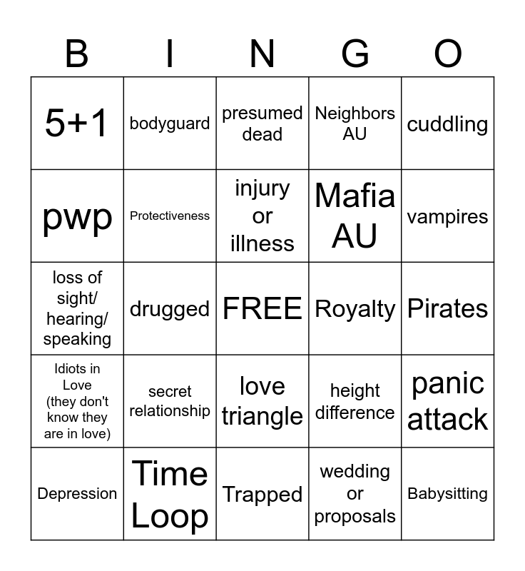 This bingo card has a free space and 24 words: secret relationship, Time Loop, injury or illness, Depression, cuddling, 5+1, pwp, bodyguard, Royalty, love triangle, Mafia AU, loss of sight/ hearing/ speaking, height difference, panic attack, Protectiveness, wedding or proposals, Pirates, presumed dead, vampires, drugged, Babysitting, Idiots in Love (they don't know they are in love), Neighbors AU and Trapped.