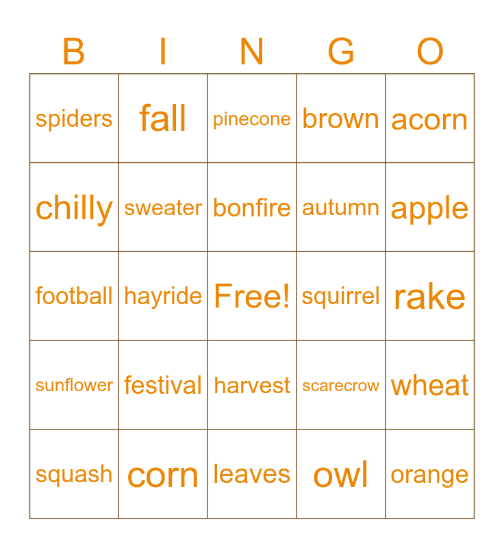 This bingo card has a free space and 27 words: scarecrow, yellow, autumn, leaves, chilly, pinecone, fall, sunflower, squirrel, wheat, football, brown, squash, corn, apple, pumpkin, sweater, bonfire, festival, spiders, rake, owl, hayride, orange, harvest, acorn and tree.