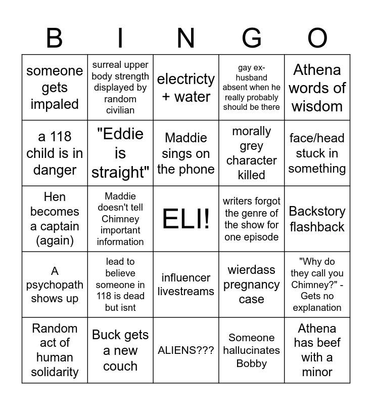 This bingo card has a free space and 24 words: lead to believe someone in 118 is dead but isnt, Buck gets a new couch, Maddie sings on the phone, Random act of human solidarity, Athena words of wisdom, someone gets impaled, a 118 child is in danger, surreal upper body strength displayed by random civilian, writers forgot the genre of the show for one episode, influencer livestreams, morally grey character killed, Hen becomes a captain (again), wierdass pregnancy case, "Why do they call you Chimney?" -Gets no explanation, "Eddie is straight", Someone hallucinates Bobby, Backstory flashback, electricty + water, face/head stuck in something, Maddie doesn't tell Chimney important information, Athena has beef with a minor, A psychopath shows up, gay ex-husband absent when he really probably should be there and ALIENS???.