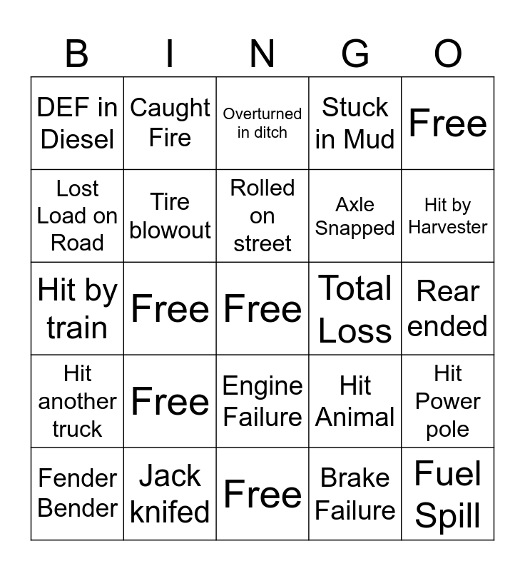 This bingo card has a free space and 24 words: Free, Jack knifed, Rolled on street, Fender Bender, Free, DEF in Diesel, Lost Load on Road, Caught Fire, Total Loss, Engine Failure, Axle Snapped, Hit by train, Hit Animal, Hit Power pole, Tire blowout, Brake Failure, Rear ended, Overturned in ditch, Hit by Harvester, Free, Fuel Spill, Hit another truck, Stuck in Mud and Free.