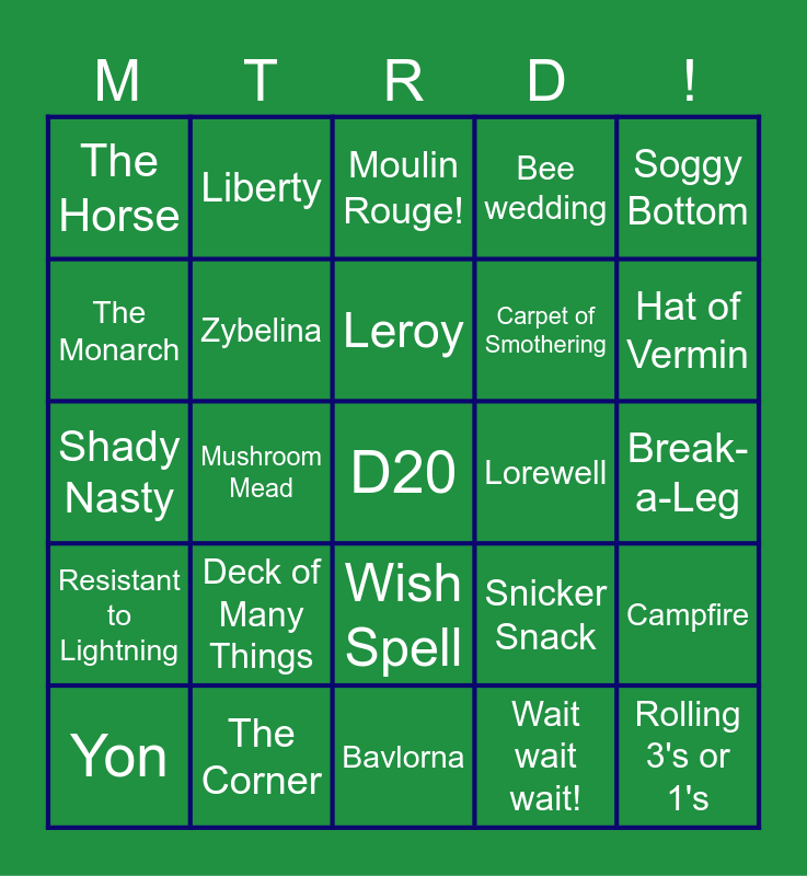 This bingo card has a free space and 25 words: Deck of Many Things, Bavlorna, Leroy, Yon, Soggy Bottom, The Horse, The Monarch, Liberty, Lorewell, Wish Spell, Carpet of Smothering, Shady Nasty, Snicker Snack, Campfire, Zybelina, Morgort, Break-a-Leg, Moulin Rouge!, Hat of Vermin, Mushroom Mead, Rolling 3's or 1's, The Corner, Resistant to Lightning, Bee wedding and Wait wait wait!.