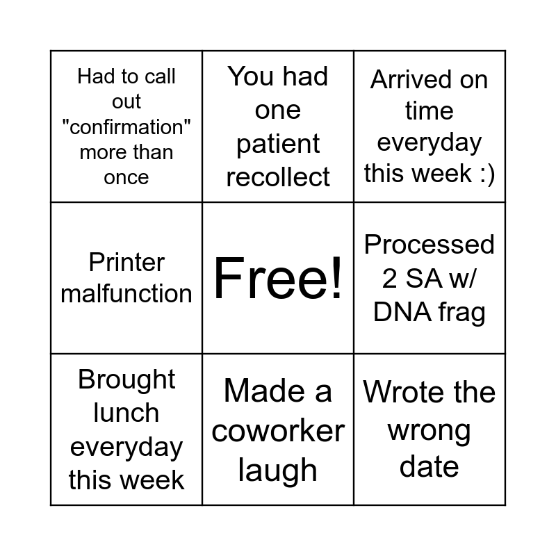 This bingo card has a free space and 8 words: Processed 2 SA w/ DNA frag, Arrived on time everyday this week :), You had one patient recollect, Brought lunch everyday this week, Had to call out "confirmation" more than once, Wrote the wrong date, Printer malfunction and Made a coworker laugh.