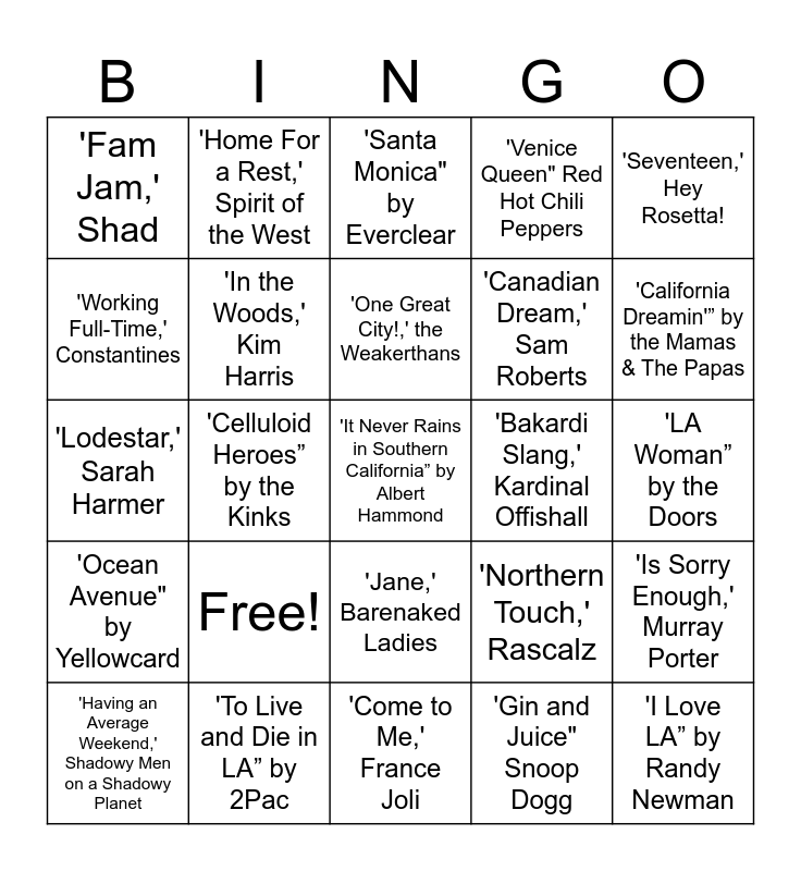 This bingo card has 25 words: Free!, 'Come to Me,' France Joli, 'One Great City!,' the Weakerthans, 'Having an Average Weekend,' Shadowy Men on a Shadowy Planet, 'Seventeen,' Hey Rosetta!, 'Fam Jam,' Shad, 'Working Full-Time,' Constantines, 'Home For a Rest,' Spirit of the West, 'Bakardi Slang,' Kardinal Offishall, 'Jane,' Barenaked Ladies, 'Canadian Dream,' Sam Roberts, 'Lodestar,' Sarah Harmer, 'Northern Touch,' Rascalz, 'Is Sorry Enough,' Murray Porter, 'In the Woods,' Kim Harris, 'I Love LA” by Randy Newman, 'LA Woman” by the Doors, 'Santa Monica" by Everclear, 'California Dreamin'” by the Mamas & The Papas, 'Celluloid Heroes” by the Kinks, 'It Never Rains in Southern California” by Albert Hammond, 'To Live and Die in LA” by 2Pac, 'Ocean Avenue" by Yellowcard, 'Venice Queen" Red Hot Chili Peppers and 'Gin and Juice" Snoop Dogg.