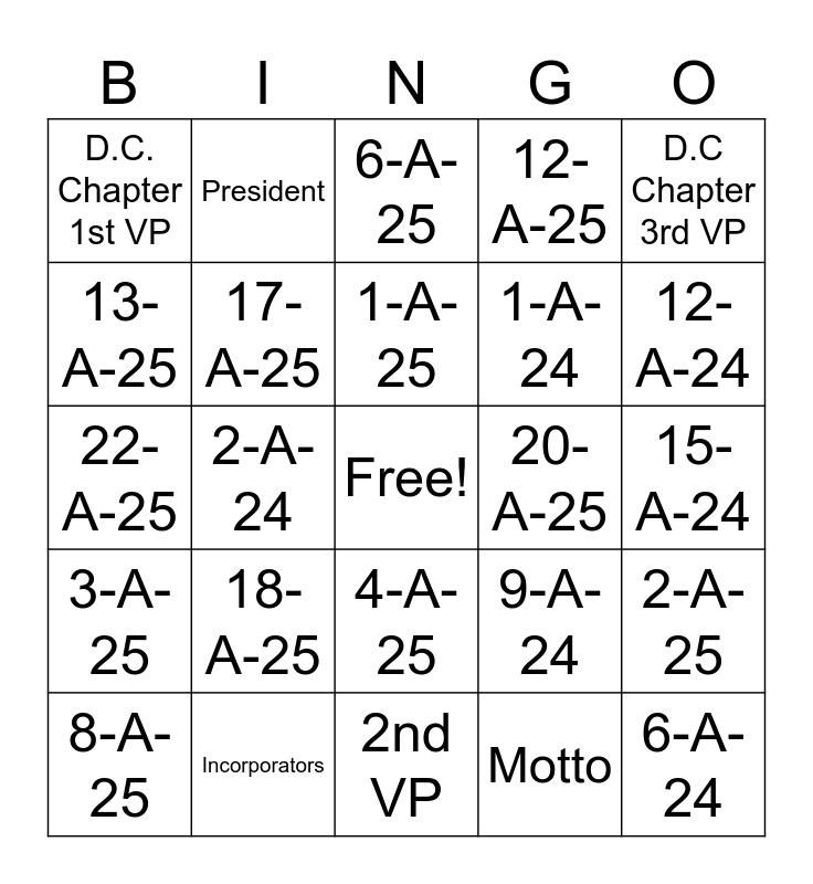 This bingo card has a free space and 68 words: 7-A-24, 6-A-24, Recording Secretary, 9-A-25, 13-A-24, 21-A-25, President, 5-A-24, 1-A-25, 7-A-25, 4-A-25, Pillars, 15-A-24, D.C Chapter 3rd VP, Community Service/PAC Chair, 13-A-25, 2-A-24, D.C. Chapter 1st VP, Founders, 18-A-25, 1-A-24, 9-A-24, 3-A-25, Incorporation Date, 4-A-25, 3-A-24, 5-A-25, 15-A-25, 2-A-25, Corresponding Secretary, 6-A-25, D.C State Director, 10-A-25, D.C Chapter Pres, 12-A-25, 14-A-25, 11-A-25, 8-A-25, 12-A-24, 22-A-25, 8-A-24, 16-A-25, 17-A-25, 14-A-24, Treasurer, 1st VP, 19-A-25, 11-A-24, 20-A-25, Incorporators, Parliamentarian, 3rd VP, Public Relations, 2nd VP, D.C Chapter Charter Date, Founding Date, Motto, Colors, Founding Belief, Eastern Regional Director, Creation, Flower, Initiates, Symbol, 5-A-16, 10-A-24, D.C Chapter 2nd VP and International President.