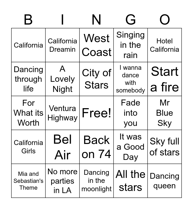 This bingo card has a free space and 33 words: Another Day of Sun, It Never Rains in Southern California, Ventura Highway, Someone in the Crowd, California Girls, A Lovely Night, Hotel California, Mia and Sebastian's Theme, California Dreamin, Malibu, City of Stars, West Coast, Pretty Woman, Twinkle Twinkle, Fade into you, Start a fire, No more parties in LA, For What its Worth, Bel Air, It was a Good Day, Back on 74, Beaches, California, Mr Blue Sky, Dancing in the moonlight, Dancing queen, Singing in the rain, I wanna dance with somebody, Dancing through life, Sky full of stars, Piano man, All the stars and Starlight.