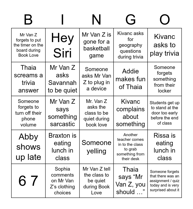 This bingo card has a free space and 31 words: Mr Van Z tell the class to be quiet during Book Love, Mr Van Z misreads something on a handout, Mr Van Z says something sarcastic, Mr Van Z misspells a word on the board, Mr Van Z forgets to put the timer on the board during Book Love, Mr Van Z is gone for a basketball game, Mr Van Z asks Savannah to be quiet, Another teacher comes in to the class to grab something from their desk, Kivanc complains about something, Thaia says “Mr Van Z, you should …”, Students get up to stand at the door too early before the end of class, Someone forgets that there was an assignment / quiz today and is very surprised about it, We play trivia at the end of class, Arianna wants a different flavour of candy, Someone forgets something from their locker, Cody needs to fill his water bottle / go to the washroom in the first 5 minutes of class, Rissa is eating lunch in class, Braxton is eating lunch in class, Abby shows up late, Someone yelling, Kivanc asks to play trivia, Clash Royale, 6 7, Hey Siri, Addie makes fun of Thaia, Thaia screams a trivia answer, Kivanc asks for geography questions during trivia, Someone forgets to turn off their phone volume, Sophia comments on Mr Van Z’s clothing choices, Someone asks Mr Van Z to plug in a device and Savannah leaves class for more than 15 minutes.