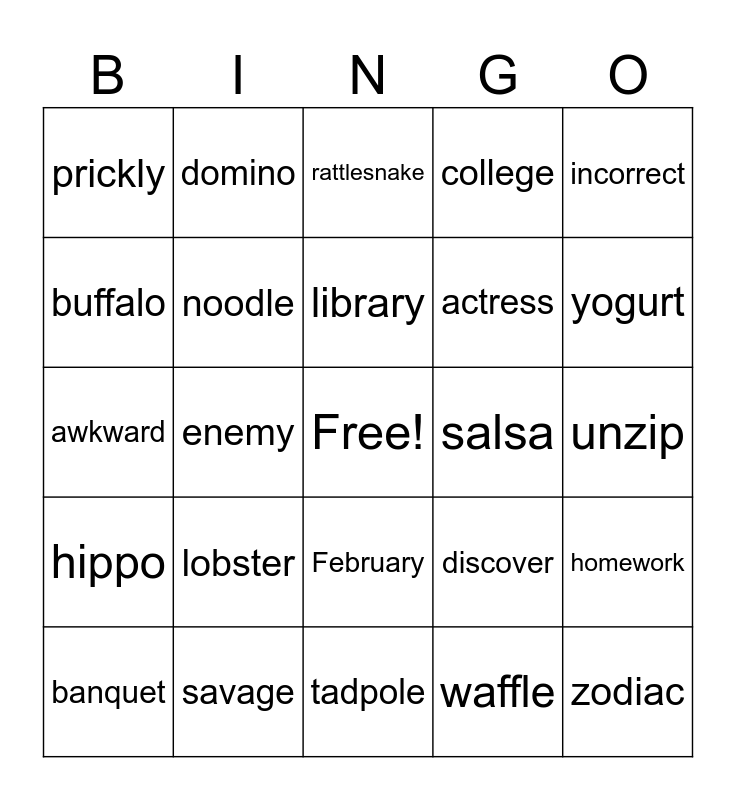 This bingo card has a free space and 29 words: banquet, certificate, enemy, fearful, prickly, rattlesnake, noodle, lobster, salsa, savage, unzip, zodiac, tadpole, waffle, yogurt, vanish, February, hippo, incorrect, awkward, discover, elbow, actress, buffalo, college, domino, homework, library and jumbo.