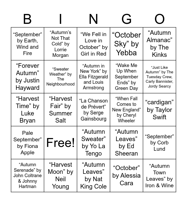 This bingo card has 25 words: Free!, “Autumn Leaves” by Nat King Cole, “Autumn in New York” by Ella Fitzgerald and Louis Armstrong, “Autumn Serenade” by John Coltrane & Johnny Hartman, “Autumn Almanac” by The Kinks, “September” by Earth, Wind and Fire, “Forever Autumn” by Justin Hayward, “Autumn’s Not That Cold” by Lorrie Morgan, “When Fall Comes to New England” by Cheryl Wheeler, “Autumn Sweater” by Yo La Tengo, “Wake Me Up When September Ends” by Green Day, “Harvest Time” by Luke Bryan, “Autumn Leaves” by Ed Sheeran, “September” by Corb Lund, “Sweater Weather” by The Neighbourhood, “Autumn Town Leaves” by Iron & Wine, “cardigan” by Taylor Swift, “We Fell in Love in October” by Girl in Red, “Just Like Autumn” by The Tuesday Crew, Carly Bannister, Jordy Searcy, “Harvest Fair” by Summer Salt, “La Chanson de Prévert” by Serge Gainsbourg, “Harvest Moon” by Neil Young, Pale September” by Fiona Apple, “October Sky” by Yebba and “October” by Alessia Cara.