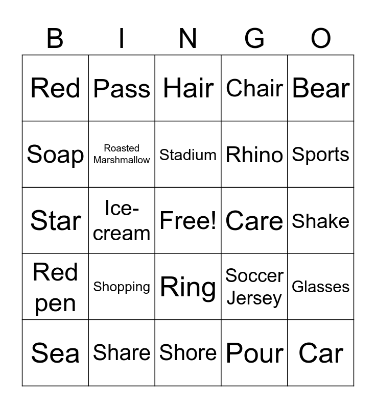 This bingo card has 1 images, a free space and 44 words: Car, Far, Sea, Ocean, Pour, Hair, Fair, Bear, Share, Chair, Care, Ring, Shopping, Short, Shore, Sea shore, Star, Ronaldo, Sports, Pass, Superbown, Silent, Red, ANgry, Shake, Milkshake, Jersey, Soccer Jersey, Red pen, Red Marker, Glasses, Shirt, Stuff, Icing, Ice-cream, Strawberry Ice-cream, She, Eyelashes, Stadium, Soap, Rhino, Rattle snake, Roasted Marshmallow and Tower.