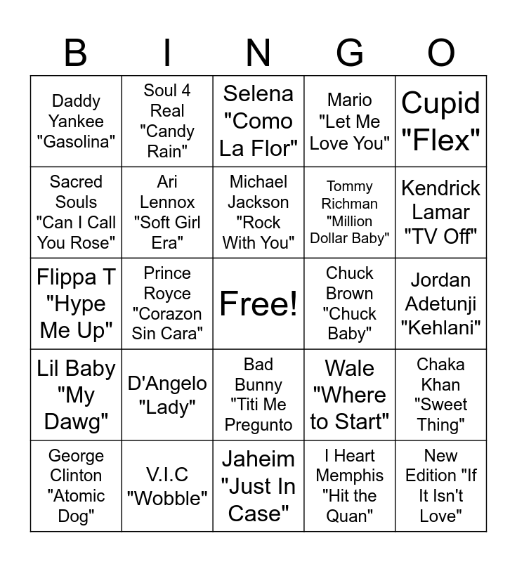 This bingo card has a free space and 24 words: D'Angelo "Lady", V.I.C "Wobble", Michael Jackson "Rock With You", George Clinton "Atomic Dog", Cupid "Flex", Daddy Yankee "Gasolina", Sacred Souls "Can I Call You Rose", Soul 4 Real "Candy Rain", Chuck Brown "Chuck Baby", Bad Bunny "Titi Me Pregunto, Tommy Richman "Million Dollar Baby", Flippa T "Hype Me Up", Wale "Where to Start", Chaka Khan "Sweet Thing", Ari Lennox "Soft Girl Era", I Heart Memphis "Hit the Quan", Jordan Adetunji "Kehlani", Selena "Como La Flor", Kendrick Lamar "TV Off", Prince Royce "Corazon Sin Cara", New Edition "If It Isn't Love", Lil Baby "My Dawg", Mario "Let Me Love You" and Jaheim "Just In Case".